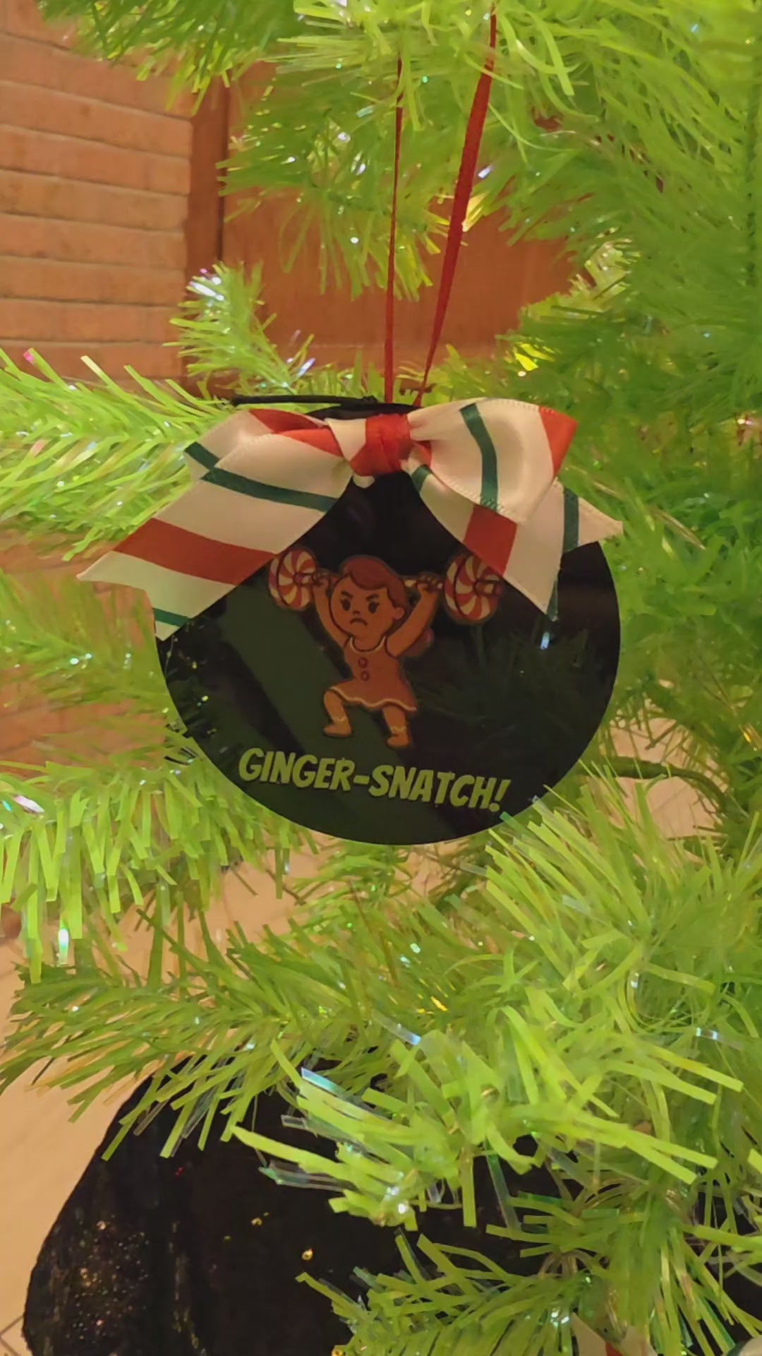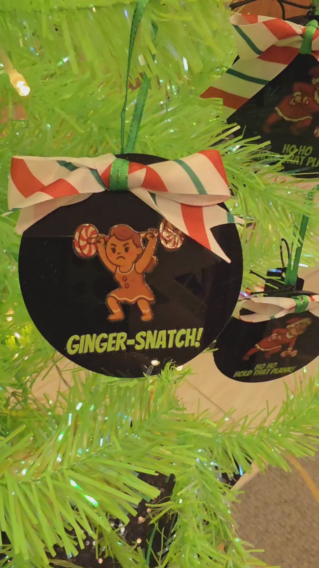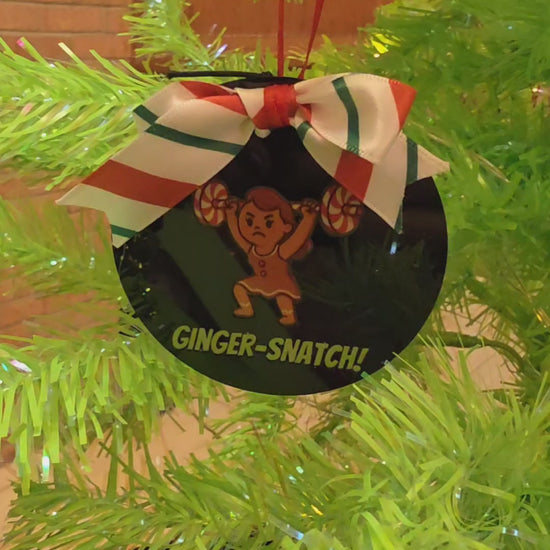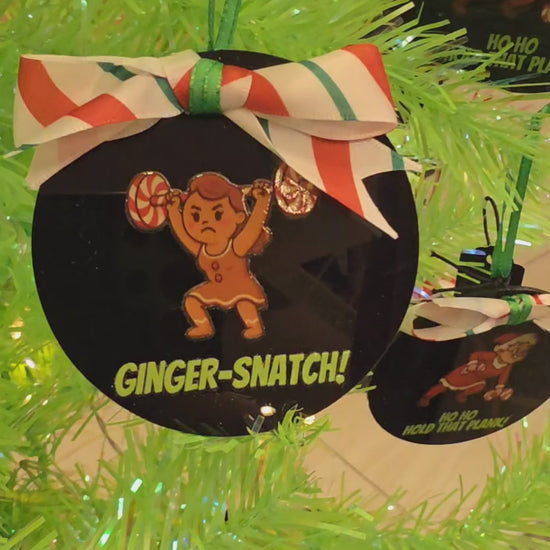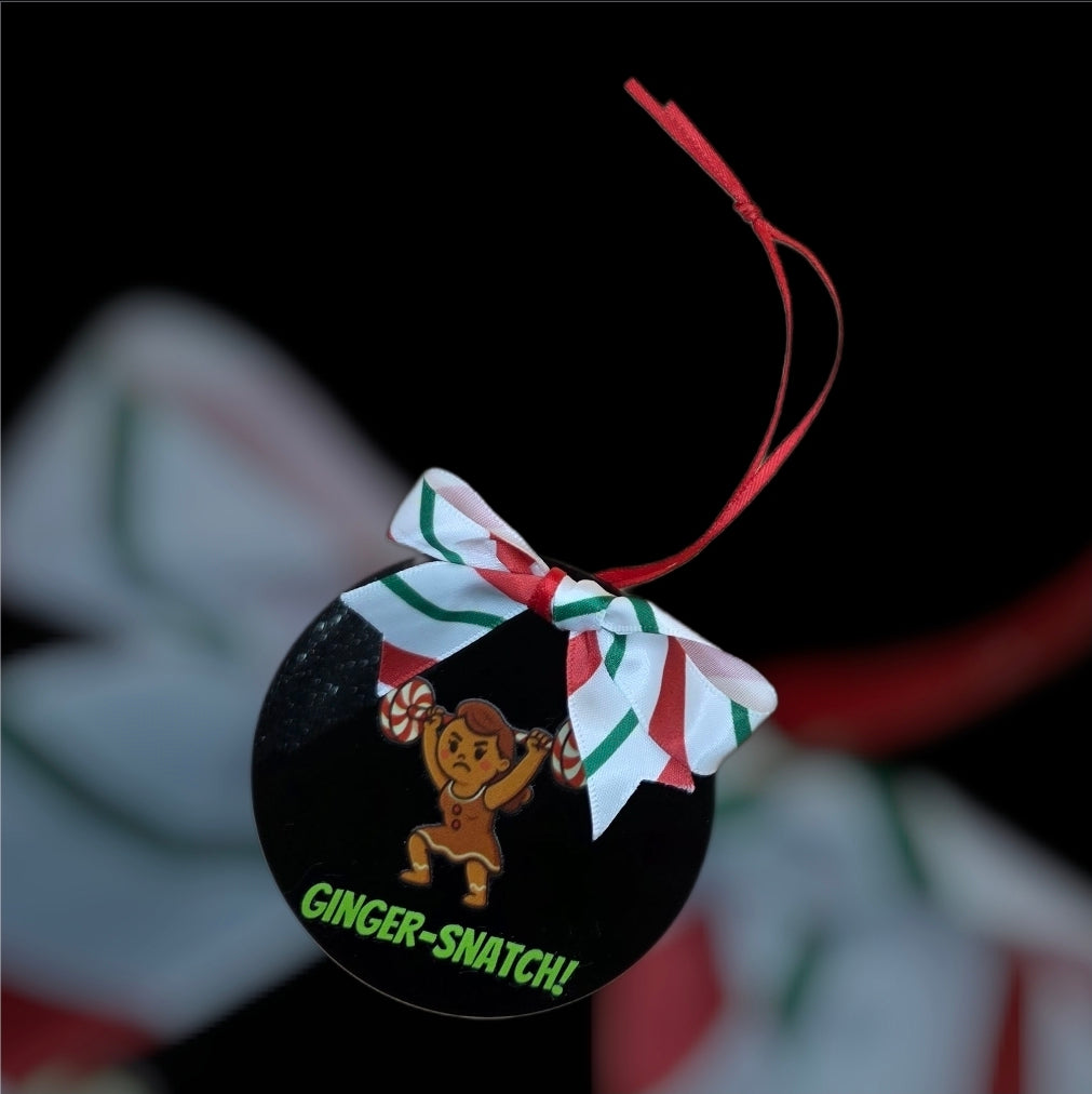Add a dash of holiday humor and strength to your tree with our Ginger-Snatch Acrylic Ornament! This 3-inch flat black acrylic disk features a spirited cartoon of a female gingerbread lifter mid-snatch with a barbell overhead, paired with the cheeky phrase “ginger-snatch!”A festive pun for fitness lovers and pun enthusiasts alike.