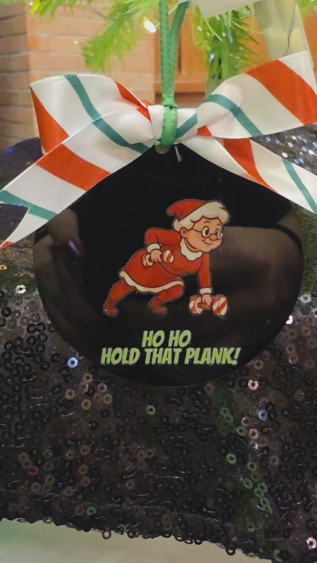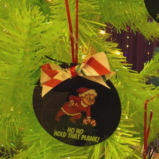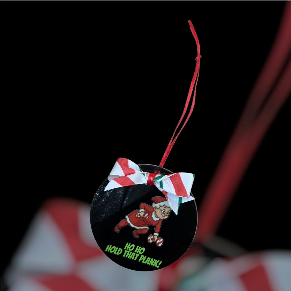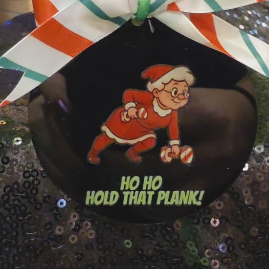 Mrs. Claus is bringing the heat this holiday season and she’s not skipping core day. This 3-inch flat black acrylic ornament features a bold cartoon of Mrs. Claus mid-plank, one dumbbell grounded, the other pulled in tight, with the cheeky phrase “Ho Ho Hold That Plank” below her. She’s strong, sassy, and sleighing her workout.