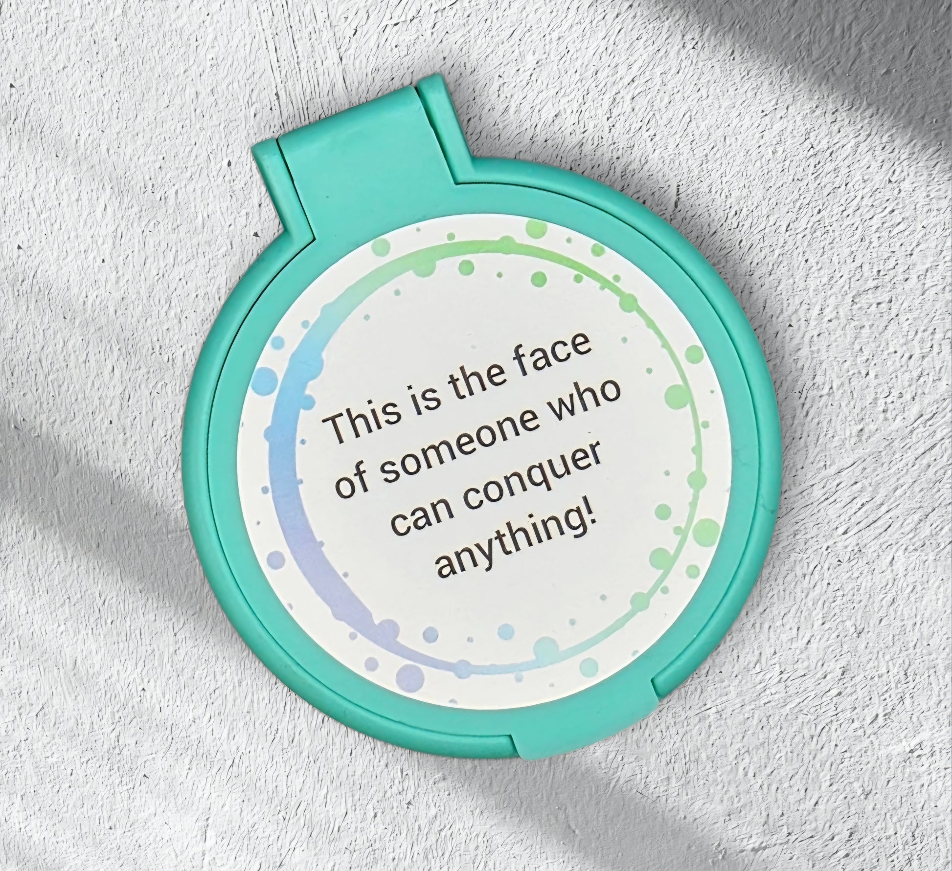 Add a touch of daily motivation to your routine with this stylish pocket mirror. The compact, circular design fits effortlessly into your bag, purse, or pocket, making it perfect for on-the-go touch-ups.