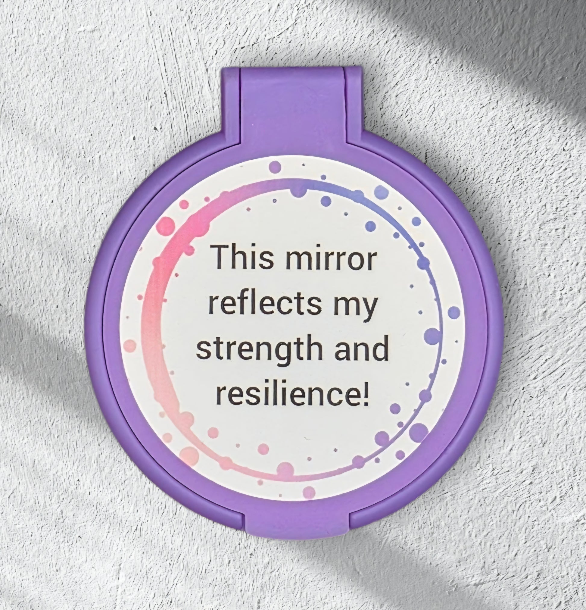 Add a touch of daily motivation to your routine with this stylish pocket mirror. The compact, circular design fits effortlessly into your bag, purse, or pocket, making it perfect for on-the-go touch-ups.